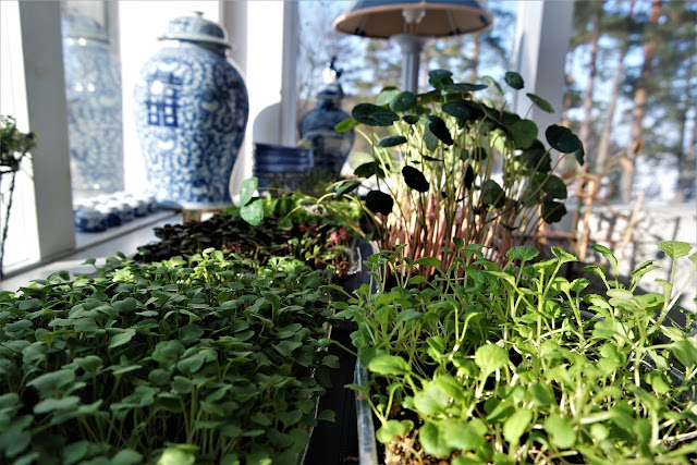 Aptiten växte i takt med odlandet och jag beställde microgreens frön från utlandet. Microskotten växer snabbt: flera cm på ett par veckor och vem som helst klarar av att odla dem på fönsterbrädet. Lätt som en plätt ... bara du kommer ihåg att vattna regelbundet. Det känns rent ut sagt lyxigt att klippa microrucola, vattenkrasse eller ängssyra på morgonsmörgåsen när kölden knäpper i knutarna och snön väller ner. Senapens och krassens blad smakar lite som pepparrot och smörgåskrassen är piggt pepprig i smaken.